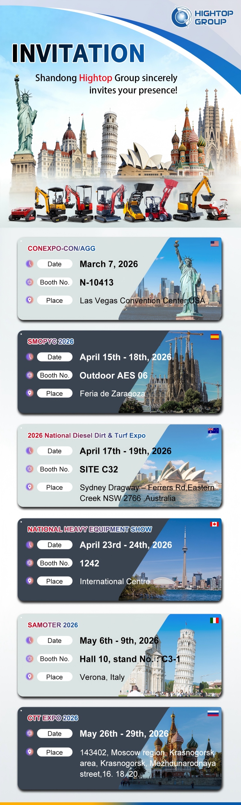 As one of Southern Europe's most influential construction machinery exhibitions, SMOPYC represents a crucial stop for Hightop's deepening engagement in the European market. We will showcase environmentally friendly equipment compliant with EU standards, engaging in face-to-face discussions with Iberian Peninsula clients to explore new collaboration opportunities.