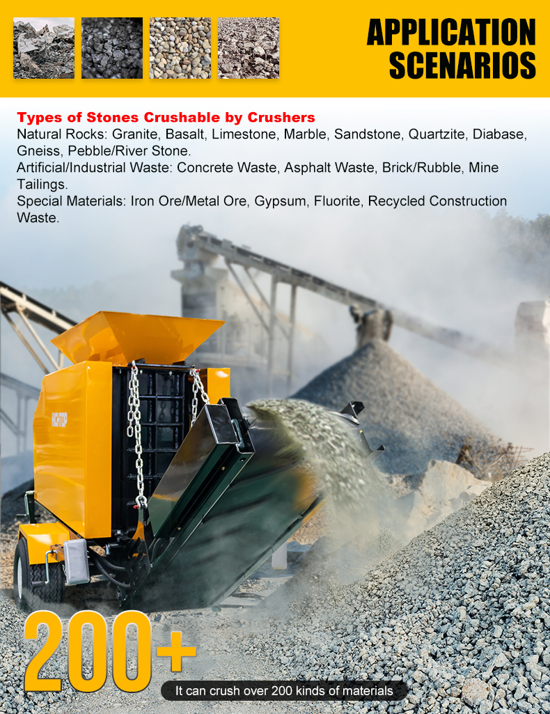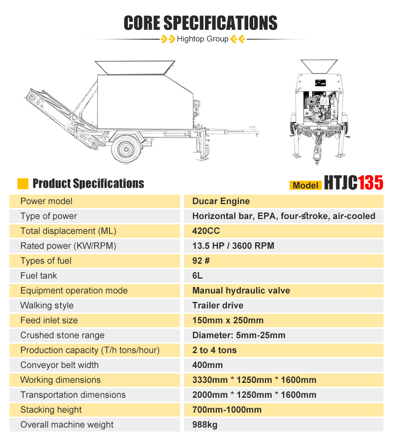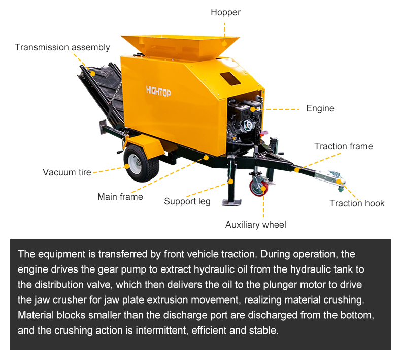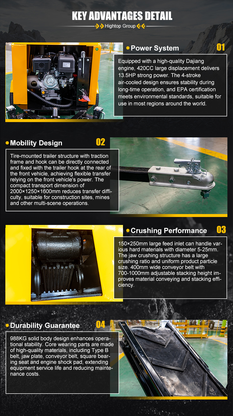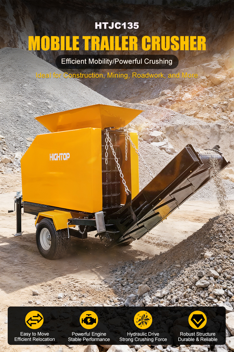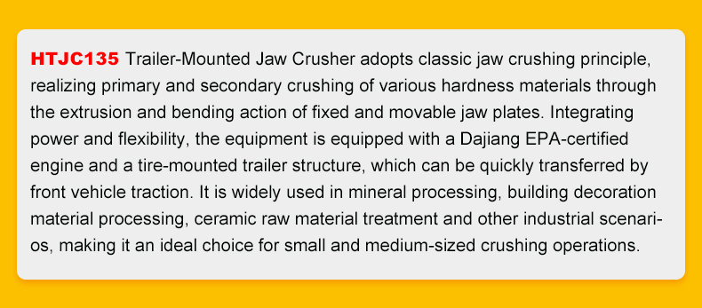HTJC135 Trailer-Mounted Jaw Crusher adopts classic jaw crushing principle.realizing primary and secondary crushing of various hardness materials throughthe extrusion and bending action of fixed and movable jaw plates. Integratingpower and flexibility, the equipment is equipped with a Dajiang EPA-certifiedengine and a tire-mounted trailer structure, which can be quickly transferred byfront vehicle traction. lt is widely used in mineral processing, building decorationmaterial processing, ceramic raw material treatment and other industrial scenari-os, making it an ideal choice for small and medium-sized crushing operations.